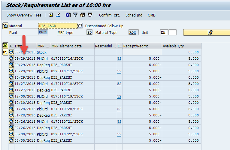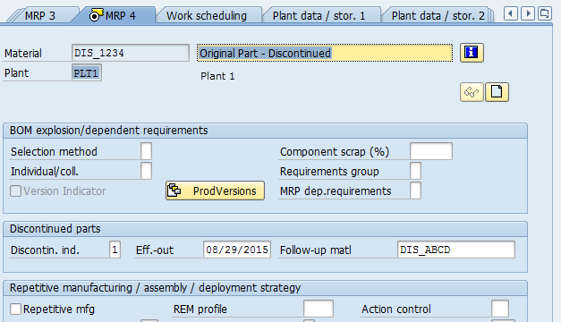 - That the discontinued part (DIS_1234) has requirements out to 08/28/15. The effective out date on its material master is 08/29/15.