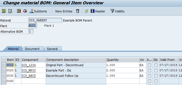 Will be replacing component DIS_1234 (Original Part – Discontinued) with follow up component DIS_ABCD (Discontinued Follow Up). If the following information is not maintained in the BOM MRP will not plan the Follow Up material.
